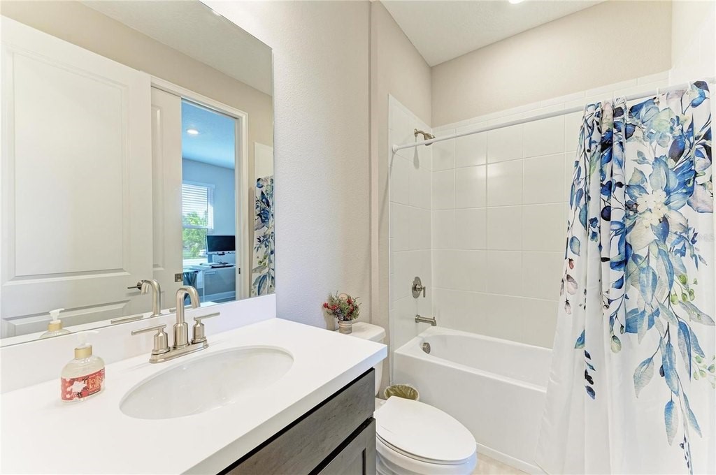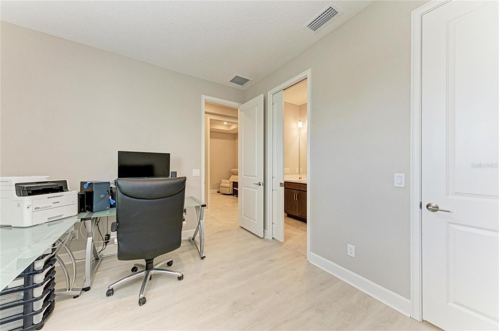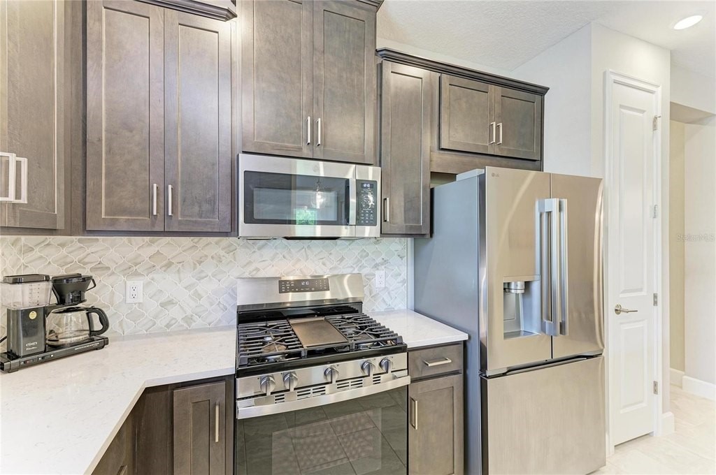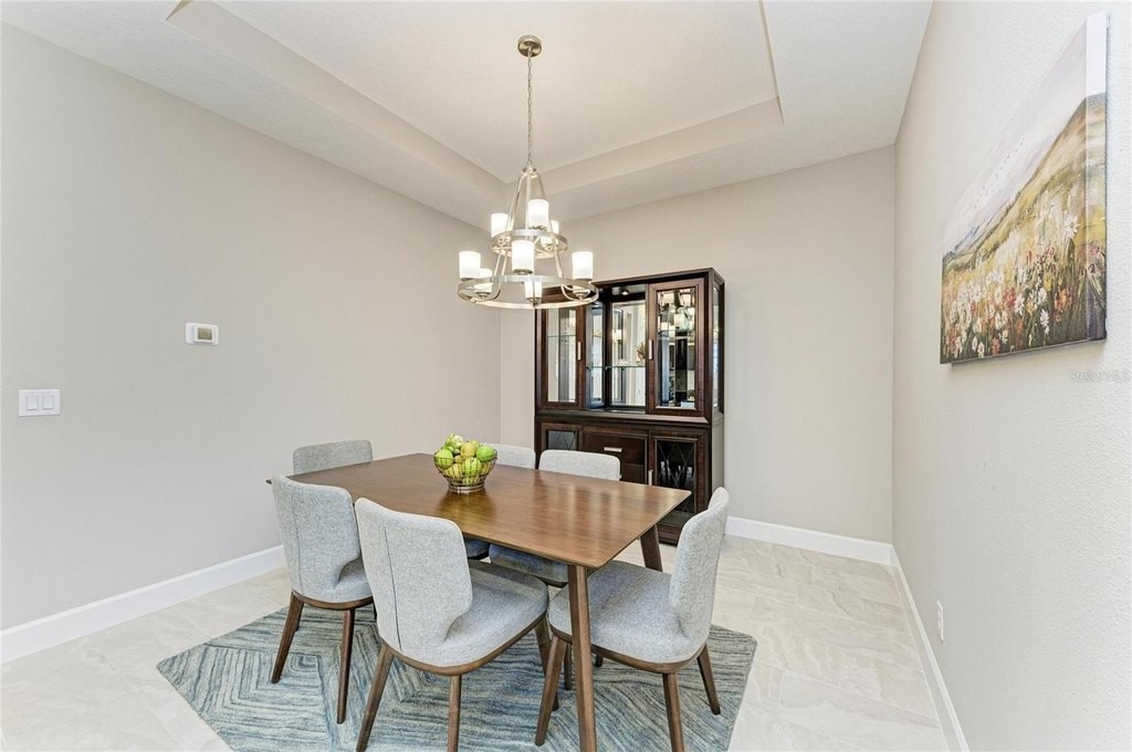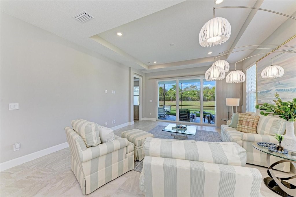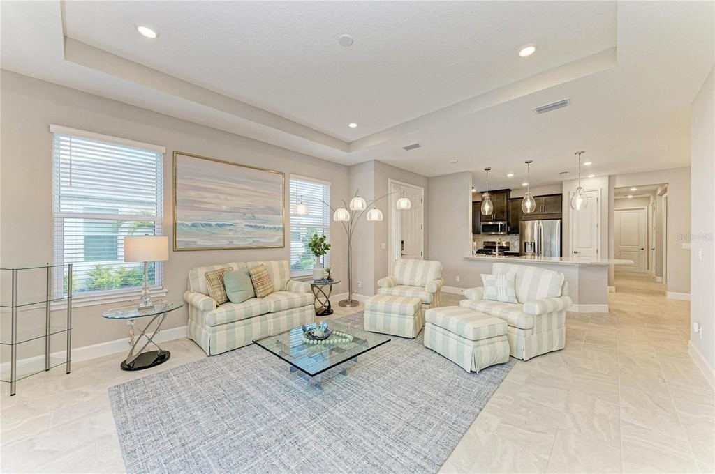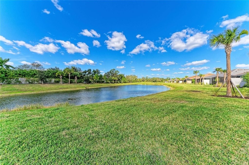 Like-new 2025 coastal-inspired WATERFRONT twin villa with breathtaking water views on a private dead-end street in the gated Esplanade at The Heights. This move-in-ready Ibis floor plan by Taylor Morrison features a sleek flat tile roof, rare water-access lot with a spacious backyard, 2 bedrooms, 2 bathrooms, and a versatile den/study that can serve as a 3rd bedroom, offering a fresh, modern alternative to older Mediterranean elevations. This light-filled home features IMPACT RESISTANT windows and sliding glass doors for energy efficiency, storm protection, and year-round comfort. The open Gathering Room showcases a tray ceiling with four recessed lights and sliders leading to the screened-in lanai with gorgeous and tranquil water views. The chefs kitchen includes natural gas cooking, quartz countertops, a stainless-steel farmhouse sink, upgraded 42 cabinetry, a closet pantry, and pendant lighting over the breakfast bar. The dining area with tray ceiling is perfect for entertaining. The private primary suite features peaceful water views from the row of windows, a tray ceiling, newer laminate flooring, a spa-like en-suite bath with frameless glass shower, grab bars in water closet, and a large walk-in closet. The guest bedroom includes newer laminate flooring, its own en-suite bath, walk-in closet and is located near the study/den with pocket doors, tray ceiling and recessed lighting. Additional highlights include a customized laundry room with newer washer/dryer and pre-plumbing for sink, 8-foot doors throughout, no carpeting, smart home features, and a two-car garage with newer epoxy flooring and a reinforced storm-rated door. Builders bumper to bumper warranty and mechanical warranty remains in effect and can be transferred to a new homeowner. Enjoy the Esplanade resort-style living with a clubhouse, spa, fitness center, lifestyle manager, heated pool, tennis, pickleball, bocce courts, scenic trails on Mount Tumalo, and Bark Park with exercise stations. Conveniently located near UTC, downtown Sarasota & Bradenton, I-75, Gulf beaches, top-rated schoolsand NO CDD FEES.